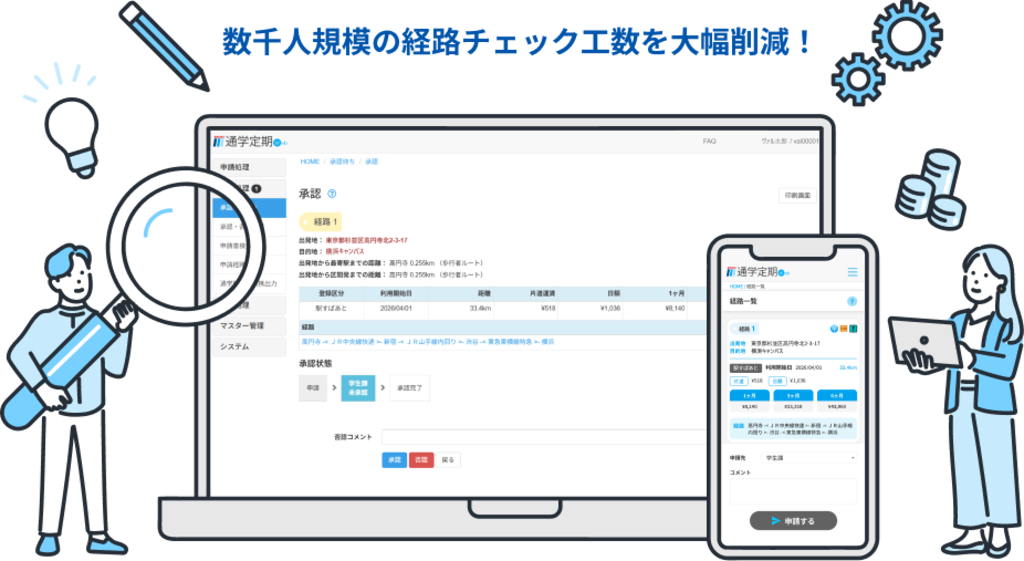 学生から申請された通学経路の妥当性確認は、設定に合わせてシステムが自動で行います。自動承認機能を利用することで、地図や経路検索サービスで確認する膨大な作業工数を削減することが可能です。